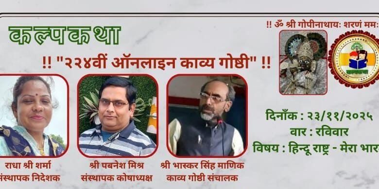 प्रभु श्री राधा गोपीनाथ जी महाराज की कृपा से संचालित, राष्ट्र प्रथम, हिन्दी भाषा, सनातन संस्कृति, एवं सद साहित्य हेतु कृत संकल्पित कल्पकथा साहित्य संस्था परिवार की संवाद प्रभारी ज्योति राघव सिंह ने बताया कि २२४वीं ऑनलाइन काव्यगोष्ठी प्रभु श्री राम की भक्ति रचनाओं से ओत – प्रोत रही।