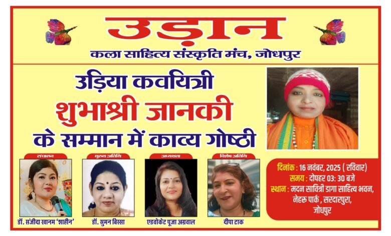 जोधपुर। कला साहित्य एवं संस्कृति मंच “उड़ान” के तत्वावधान में 16 नवम्बर, रविवार को उड़िया कवयित्री शुभाश्री जानकी के सम्मान में काव्य गोष्ठी का आयोजन होगा।