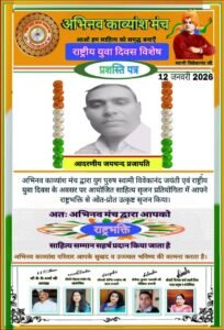 स्वामी विवेकानंद की जयंती एवं राष्ट्रीय युवा दिवस के अवसर पर अभिनव काव्य मंच ने साहित्य सृजन प्रतियोगिता का भव्य आयोजन किया। इस प्रतियोगिता में प्रयागराज के प्रख्यात कवि व्यंग्यकार जयचन्द प्रजापति ‘जय’ ने अपनी राष्ट्रभक्ति से ओतप्रोत रचना प्रस्तुत कर सभी को मंत्रमुग्ध कर दिया।