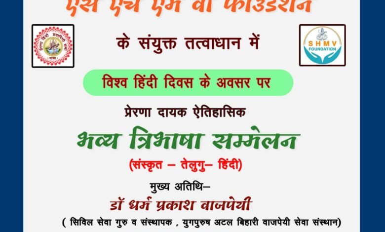 एस एच एम वी फाउंडेशन हैदराबाद के संस्थापक डॉ विजय कुमार के अनुसार त्रिभाषा सम्मेलन में मुख्य अतिथि डॉ धर्म प्रकाश वाजपेई दिल्ली व अतिथि डॉ रावी नूतला शशिधर जी आमंत्रित हैं।