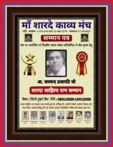 मां शारदे काव्य मंच द्वारा 9-10 जनवरी को आयोजित दो दिवसीय काव्य लेखन प्रतियोगिता में प्रयागराज के साहित्यकार जयचन्द प्रजापति ‘जय’ को उत्कृष्ट लेखन के लिए शारदा साहित्य रत्न सम्मान से नवाजा गया।
