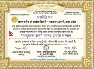 झांसी \ झांसी जिले के वरिष्ठ साहित्यकार डा राजेश तिवारी मक्खन जिला अध्यक्ष हिन्दी साहित्य भारती झांसी को शब्द प्रतिभा बहुक्षेत्रीय सम्मान फाउंडेशन नेपाल द्वारा अन्तर्राष्ट्रीय मातृभाषा दिवस पर आपके द्वारा मातृभाषा सेवा के लिए किए गए उल्लेखनीय कार्यों का मूल्यांकन कर “मातृभाषा रत्न” मानद उपाधि सम्मान से विभूषित किया गया है ।