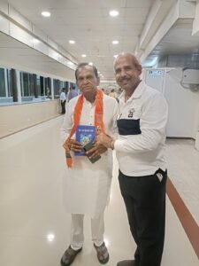 शिक्षक कवि कार्तिकेय कुमार त्रिपाठी नें भीअंतरंग मुलाकात में श्री विजयवर्गीय जी व आयोजन प्रमुख बाबा श्री परिवार के जगदीश गोयल जी को स्वरचित काव्य संग्रह मंद-मंद मुस्काते भोले..की प्रतियां भेंट की।