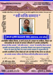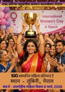 नेपाल भारत मैत्री विकास, मिथिला तथा अवध सांस्कृतिक पर्यटन विकास, देवनागरी लिपि के संरक्षण संवर्द्धन, हिंदी तथा नेपाली भाषा को मैत्री भाषा के रूप में प्रचार प्रसार करने तथा देश विदेश की विभिन्न क्षेत्र की महिला प्रतिभाओं को प्रोत्साहित करने के उद्देश्य से आज ‘अंतर्राष्ट्रीय महिला दिवस’ के अवसर पर आयोजित एक कार्यक्रम में सुनीति केशरवानी ‘नीति’ को सम्मानित किया गया है। शब्द प्रतिभा बहुक्षेत्रीय सम्मान फाउन्डेशन नेपाल द्वारा आज लेखिका सुनीति केशरवानी ‘नीति’ जी के साथ नेपाल, भारत सहित विश्व के सात देश की 300 महिला कवयित्रियों, लेखिकाओं, समाज सेविकाओं और शिक्षिकाओं को ई प्रशस्ति पत्र सर्टिफिकेट प्रदान कर सम्मानित किया गया है।