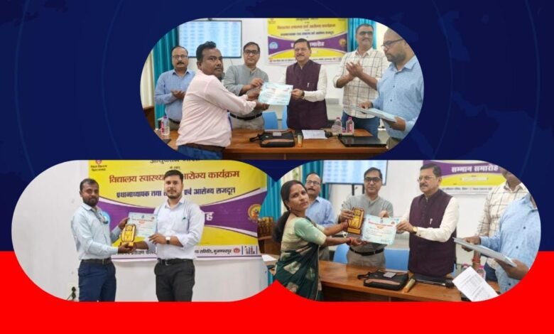 16 मार्च 2026 के दिन जिले में संचालित विद्यालय स्वास्थ्य एवं आरोग्य कार्यक्रम के अंतर्गत उत्कृष्ट कार्य के लिए उत्क्रमित मध्य विद्यालय सिमरा मल्लाह टोला के प्रधानाध्यापक अजीत कुमार, सहायक शिक्षक अनिल कुमार एवं शिक्षिका अनिता कुमारी को जिला स्तर पर सम्मानित किया गया।