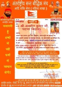 पटना। सत्य सनातन ट्स्ट द्वारा संचालित अन्तर्राष्ट्रीय सन्त बौधिक मंच के अन्तर्राष्ट्रीय अध्यक्ष स्वामी स्वदेशान्दजी ब्रह्मगिरी महाराज ने अनमोल कुमार को बिहार प्रदेश का मुख्य संगठन महामंत्री नियुक्त किया गया।