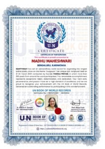 हाल ही में अंतरराष्ट्रीय साहित्य कला और संस्कृति न्यास ‘साहित्योदय’ द्वारा आयोजित ‘दुर्गायन अखण्ड काव्यार्चन’ में मधु माहेश्वरी जी ने गौरवशाली उपस्थिति दर्ज कराई। 21-22 मार्च, 2026 को आयोजित 24 घंटे के अनवरत काव्य -अनुष्ठान में आपने सक्रिय भाग लिया। इस आयोजन को ‘यूएन बुक ऑफ वर्ल्ड रिकॉर्ड’ में स्थान मिला है। यह साहित्योदय का पांचवां विश्व रिकॉर्ड है।साहित्योदय पिछले कई वर्षों दुनियाभर में साहित्य, कला, संस्कृति और सामाजिक क्षेत्र में कार्यरत है। साहित्योदय आज की पीढ़ी को सत्य सनातन, वेद पुराण, राष्ट्राचेतना, देशप्रेम और मानवता के प्रति सृजन हेतु प्रेरित कर रहा है। विभिन्न विषयों पर लेखन, प्रकाशन के साथ -साथ उसी धरा पर लोगों का काव्यपाठ और तीर्थाटन करवाने की महती भूमिका निभा रहा है। साहित्योदय से दुनियाॅं भर के लाखों रचनाकार, कलाकार और विभिन्न क्षेत्रों के प्रतिष्ठित लोग जुड़े हैं। इस आयोजन की सफलता में आपकी भक्तिमय प्रस्तुति के लिए आपको ‘आद्यशक्ति सम्मान’ एवं ‘वीणा दीप सम्मान’ से अलंकृत किया गया है।