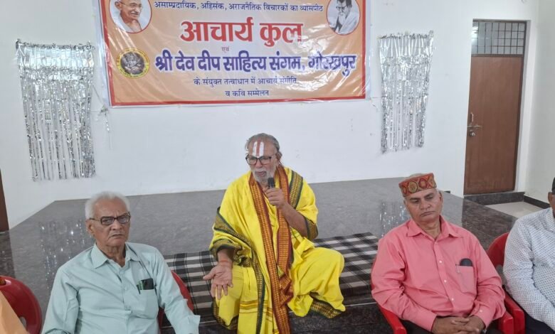 गोरखपुर। बाबा गोरक्षनाथ की पावन नगरी गोरखपुर में आचार्यकुल एवं श्री देव दीप साहित्य संगम, गोरखपुर के संयुक्त तत्वावधान में श्री विश्वकर्मा मंदिर, मानसरोवर, गोरखनाथ परिसर में आयोजित आचार्य संगति एवं कवि सम्मेलन एक दिव्य एवं भावपूर्ण आयोजन के रूप में संपन्न हुआ। आचार्यकुल के राष्ट्रीय संयोजक धर्मेन्द्र जी के कुशल निर्देशन एवं अध्यक्षता में सम्पन्न इस कार्यक्रम ने साहित्य, विज्ञान और अध्यात्म की त्रिवेणी को एक ही मंच पर संगमित कर दिया।