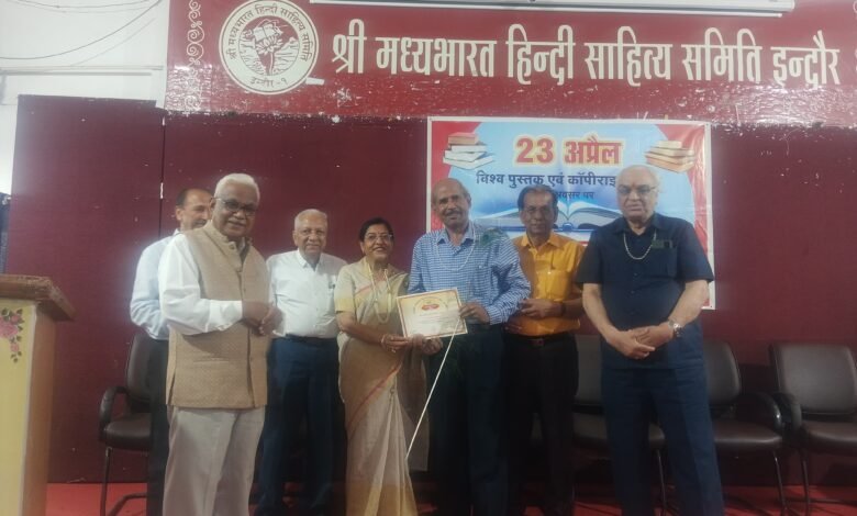 इन्दौर – गत विश्व पुस्तक दिवस पर साहित्यकारों की कर्मस्थली मध्य भारत हिन्दी साहित्य समिति में इन्दौर संभाग पुस्तकालय संघ और अहिल्या लायब्रेरी के संयुक्त तत्वावधान में देश-विदेश के चिरपरिचित कवि/लेखकों/संपादकों को सम्मानित किया गया। आध्यात्मिक काव्य लेखन में लगातार पांच वर्षों से प्रति सप्ताह अपने आराध्य भोलेनाथ पर केन्द्रित कविताएं लिख रहे इन्दौर के कार्तिकेय कुमार त्रिपाठी ‘राम’ को उनके हालिया प्रकाशित काव्य संग्रह मंद-मंद मुस्काते भोले… के लिए प्रशस्ति पत्र कृति कुसुम सम्मान और मोरपंख देकर मुख्य अतिथि आइ.आर.कुमारजी, पुस्तकालय संघ अध्यक्ष जीडी अग्रवाल,वरिष्ठ कवयित्री सोनल सिंह जैन,आई.ए.एस.डां. अशोक भार्गव जी,बी.पी.मिश्रा,महेशजी बंसल के हाथों सम्मानित किया गया।गत नवंबर 25 में लोकार्पित त्रिपाठी का यह काव्यसंग्रह लगातार चर्चाओं में बना हुआ है।यह सम्मान अप्रैल 25 से अप्रैल 26 तक प्रकाशित पुस्तकों के कवि/लेखक और संपादकों को विश्व पुस्तक और कापीराइट दिवस 23 अप्रैल को प्रतिवर्ष प्रदाय किया जाता है।
